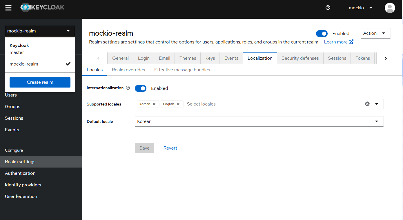 Realm settings 을 클릭 -> Localzation -> Internationalization Enabled 활성화 ->